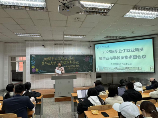 会上,孟丽老师围绕学校教务处关于确定2025届毕业生毕业与学位审查标准的通知,结合《沈阳化工大学教学培养方案》 、《沈阳化工大学学分制学籍管理办法》和《沈阳化工大学本科生学士学位授予工作有关规定》文件内容,向2025届本科生毕业生同学强调各专业的毕业条件与学位审查标准,并督促同学们利用网上办事大厅按时完成毕业与学位审查。