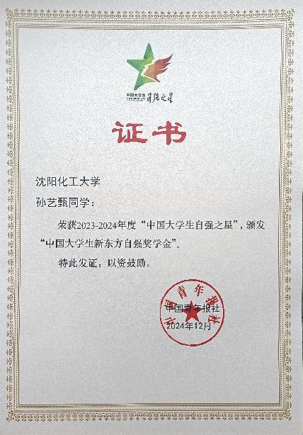 近日,从共青团中央、全国学联传来喜讯,由团中央基层建设部、中国青年报社、新东方教育科技集团、中国青年创业就业基金会联合举办的2023 - 2024年度“中国大学生自强之星”奖学金评选结果揭晓,Beat365中文官方网站孙艺甄同学凭借出色的个人表现和突出的自强事迹,荣获“中国大学生自强之星”荣誉称号。
